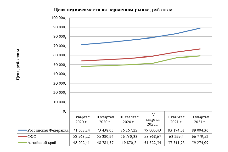 На вторичном рынке недвижимости в Алтайском крае прирост составил 23%. Так, если начало 2020 года характеризовалось ценой за квадратный метр жилья, равной 48202 рублям, то к концу июня 2021 года цена выросла до 59274 рублей.
