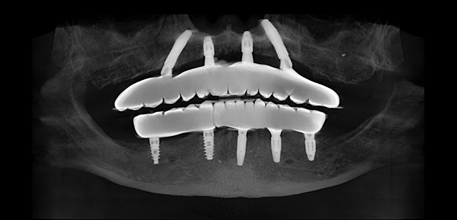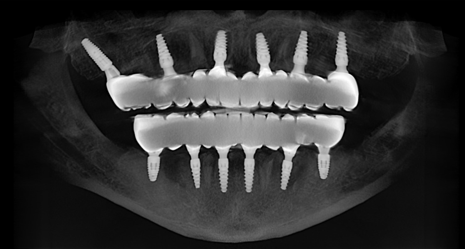 Современные имплантационные протоколы позволяют установить от 4 до 6 имплантатов на челюсть и создать на них надежную основу для несъемной конструкции, полностью восстанавливающей функцию и эстетику улыбки.